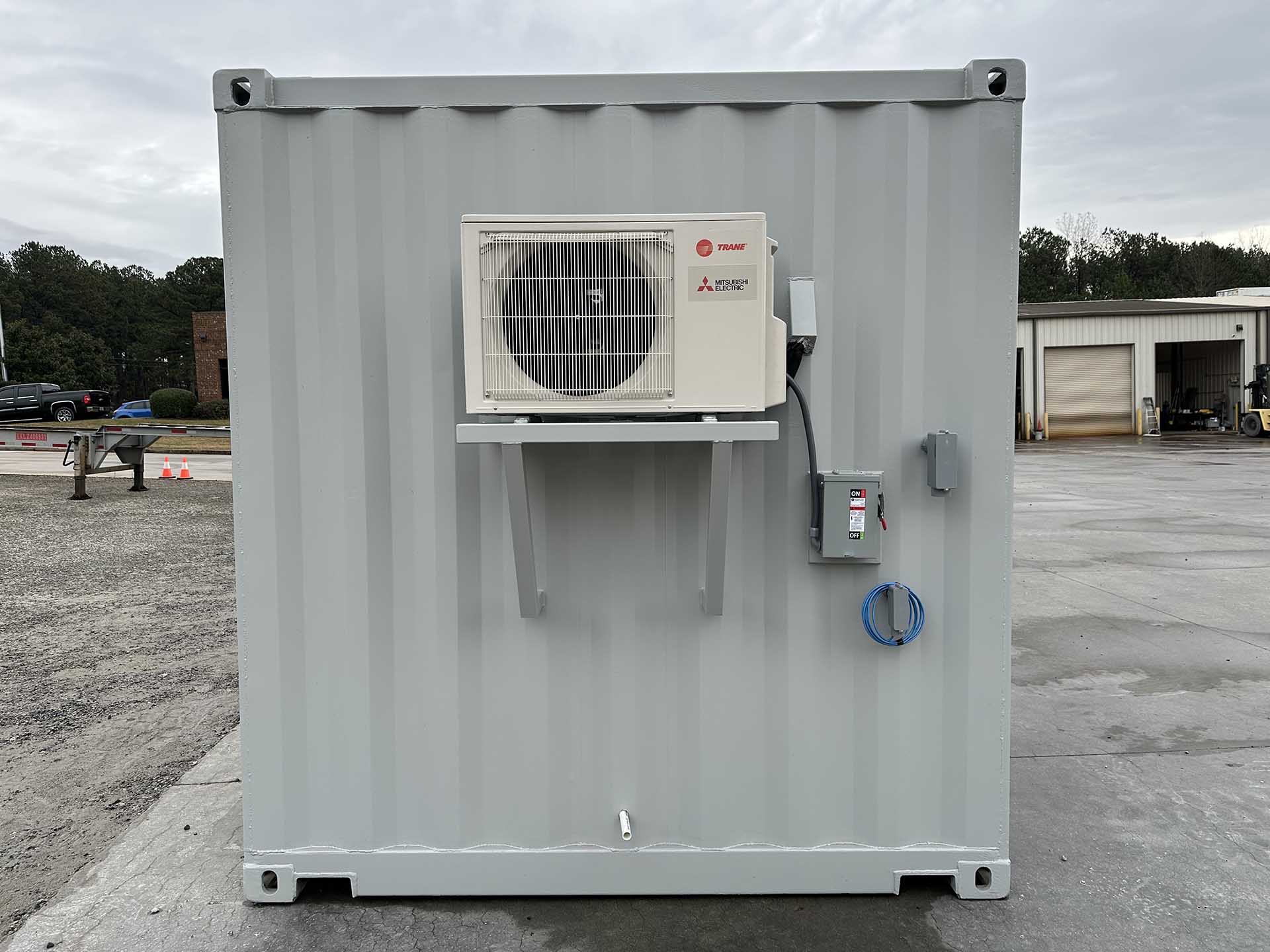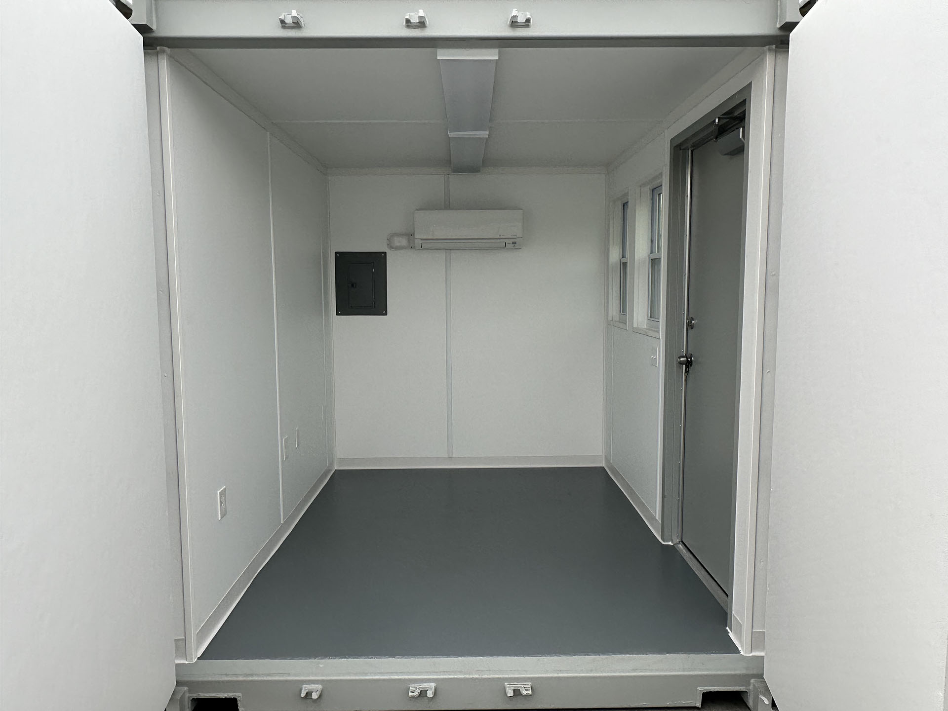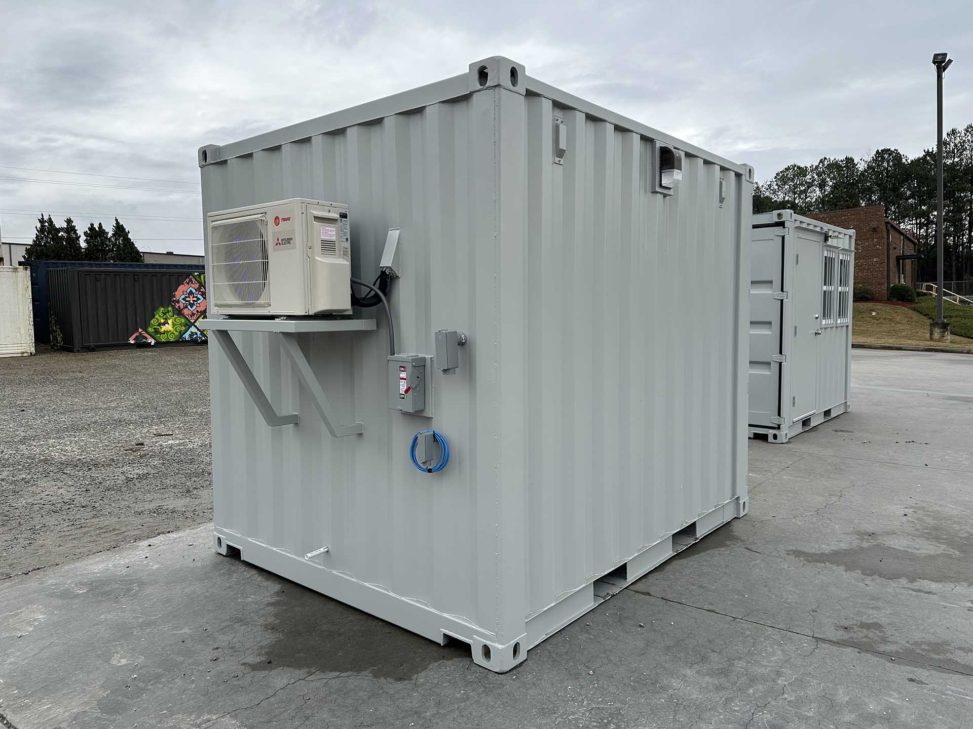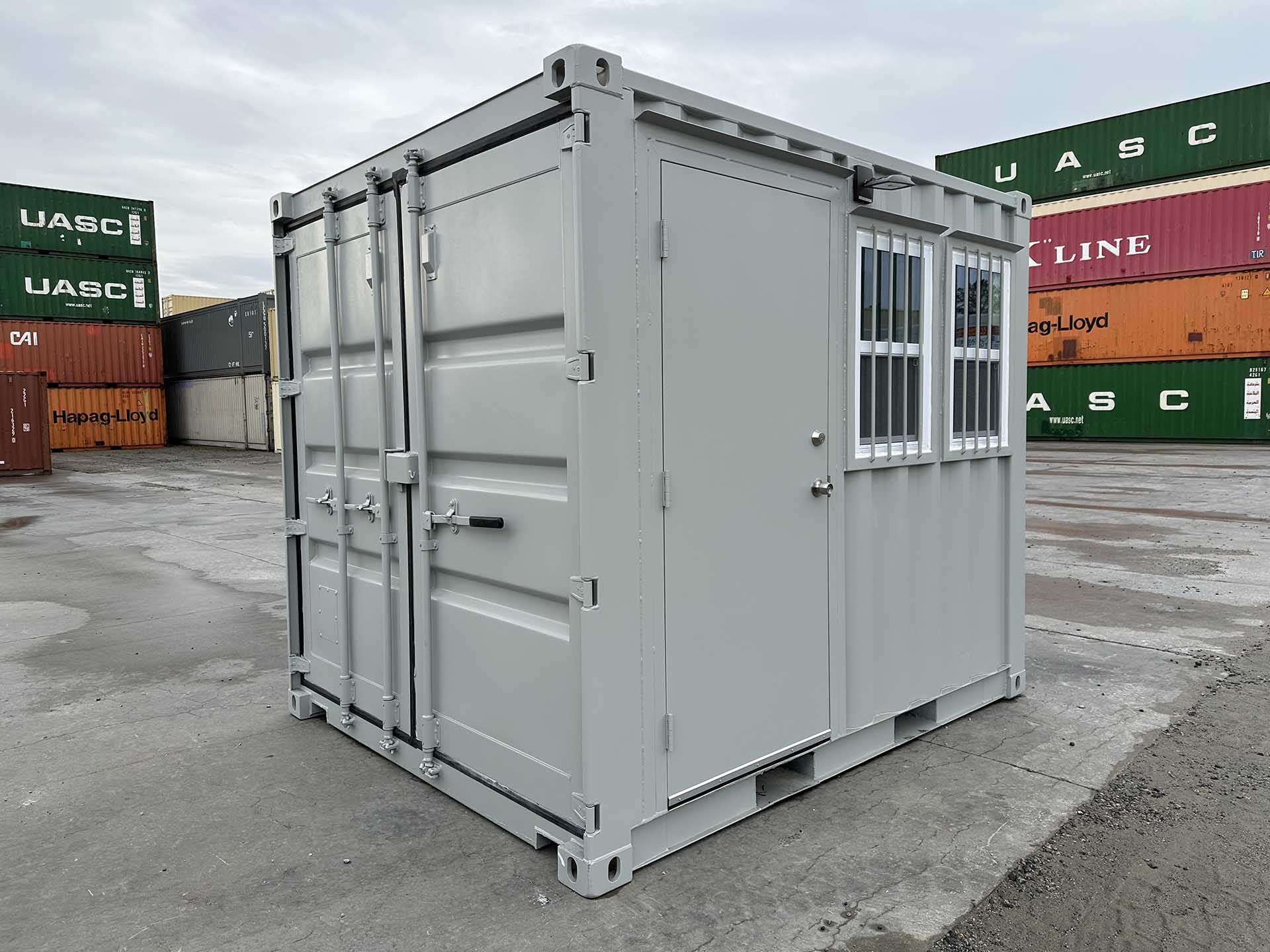 10ft Standard shipping container converted into temperature-controlled guard shack. The container is outfitted with a personnel door, windows (with security bars), finished interior, lights, outlets, and a mini split HVAC system. A vinyl overlay has been installed over the existing wood floor. The exterior has also been painted gray.