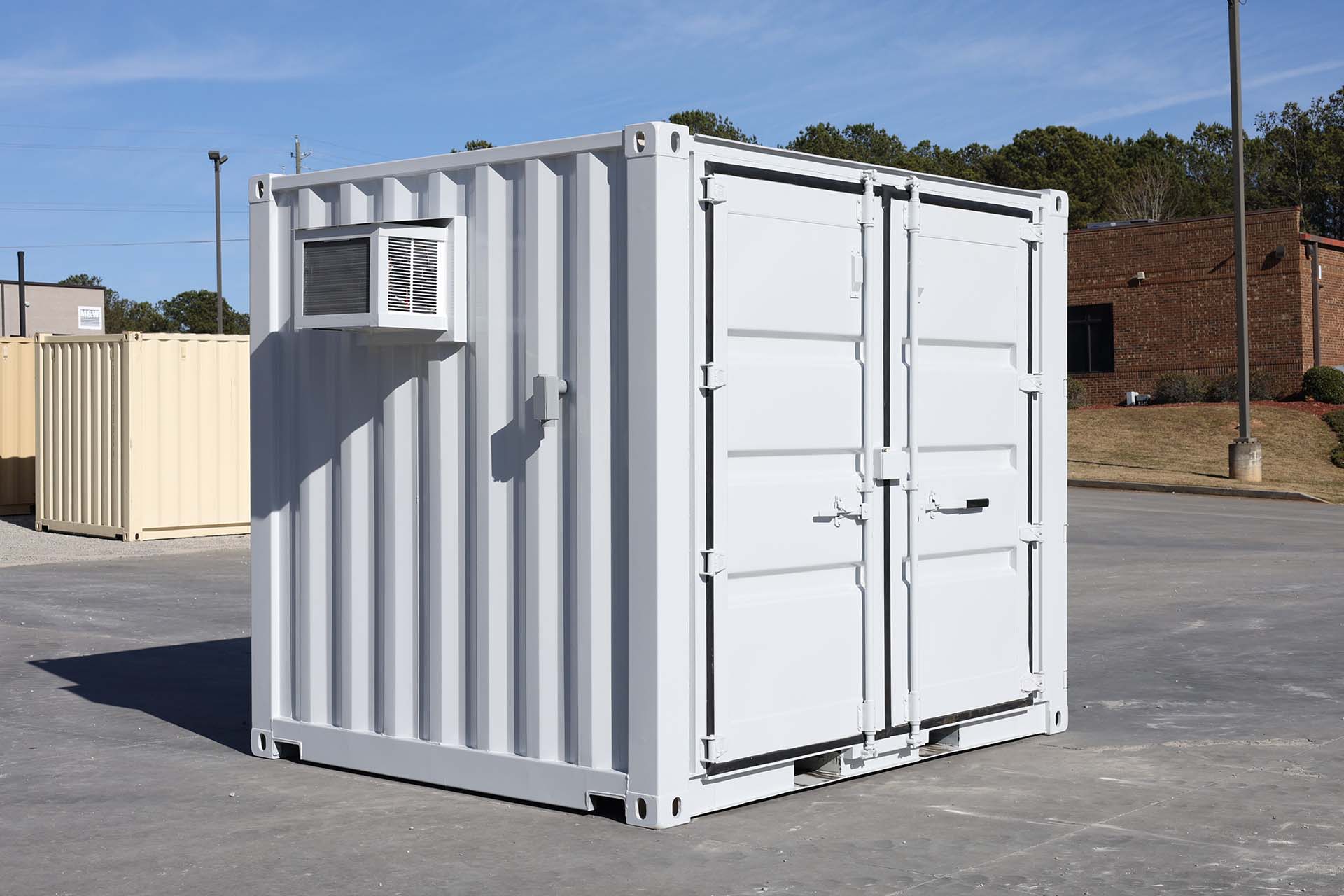 10ft Standard shipping container converted into mobile pumphouse. The container is outfitted with two additional sets of container doors, an interior light, outlet, and a small window HVAC unit. Two sections of the existing wood floor were removed and replaced with removeable steel grates for drainage. The exterior has also been painted light gray