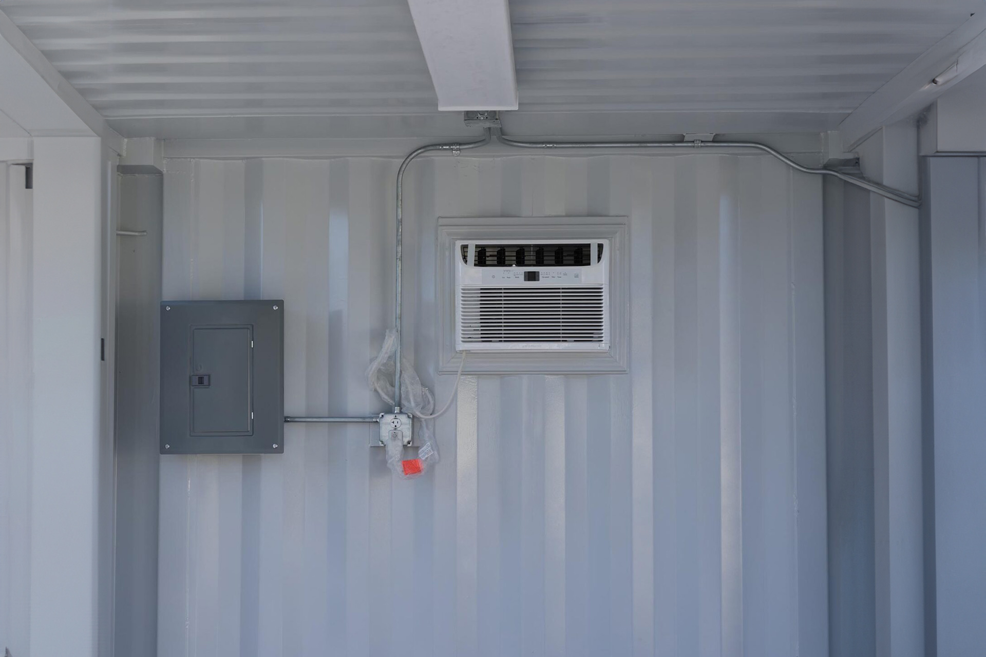 - (1) 4’ LED overhead light with switch (1) 110V quad receptacles, wired back to 100-amp panel stubbed to exterior for hardwiring
