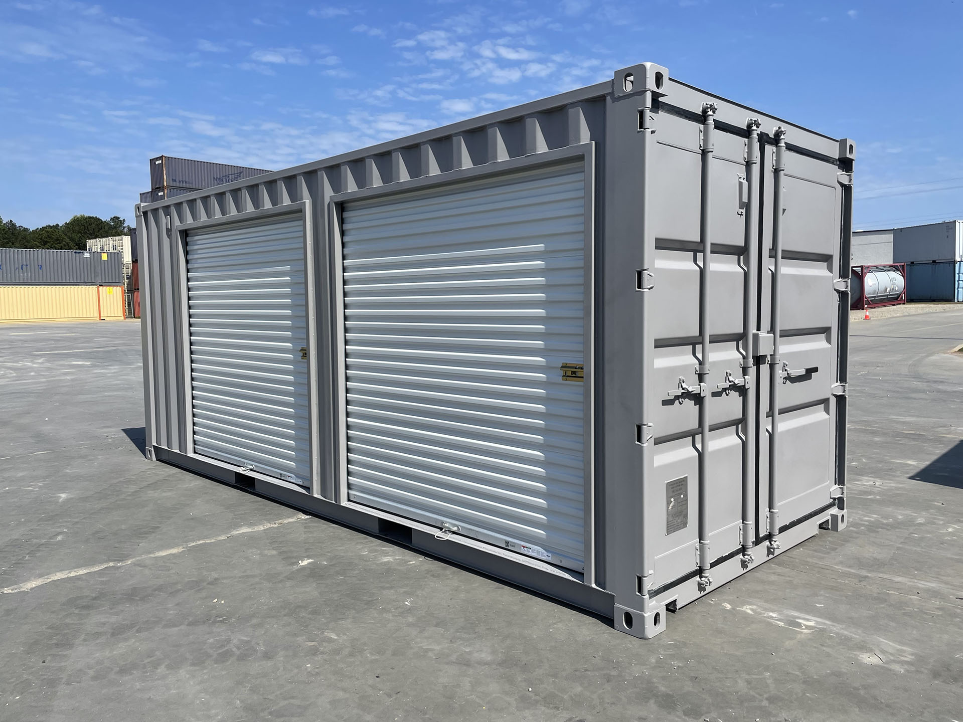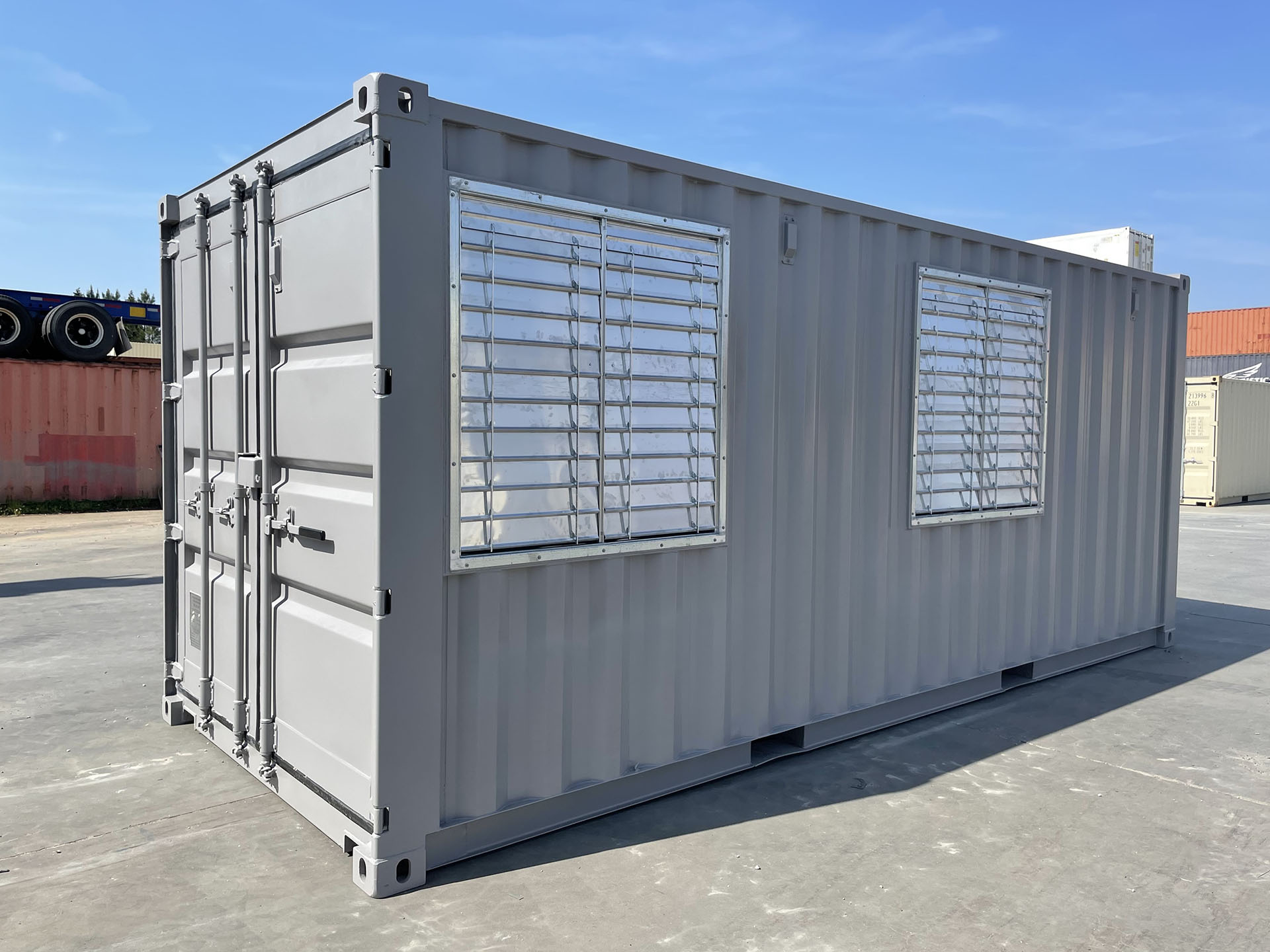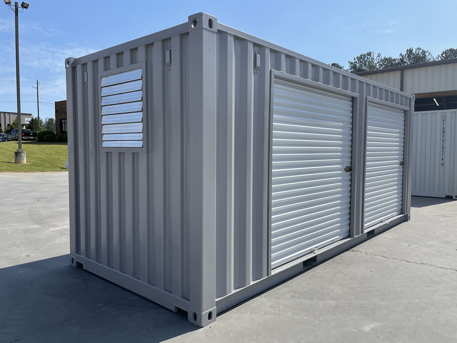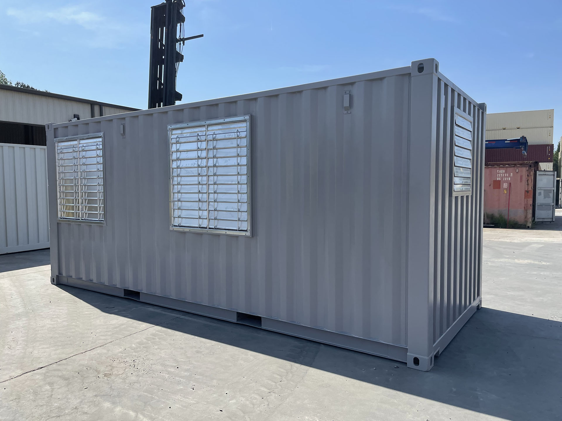 20ft Standard shipping container converted into mobile air compressor module. The container is outfitted with two 7ft mini storage roll-up doors, four large louvered vents (two on the sidewall and two on the ceiling), and a large exhaust fan. The exterior has also been painted gray.