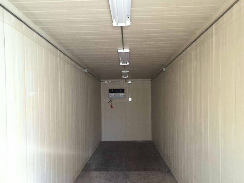 40ft High Cube container cut down to 30ft length and converted into an on-site temperature controlled storage unit for a retail clothing store.