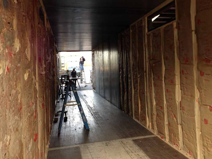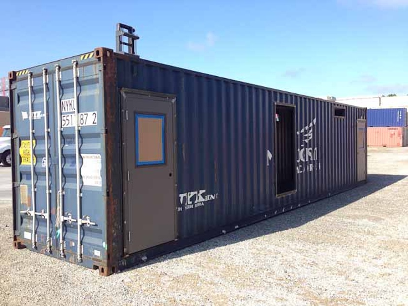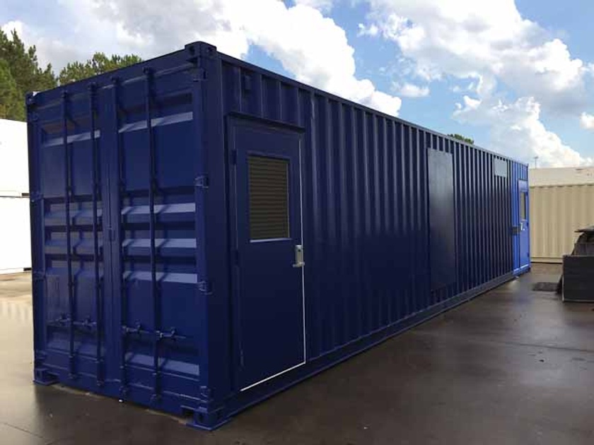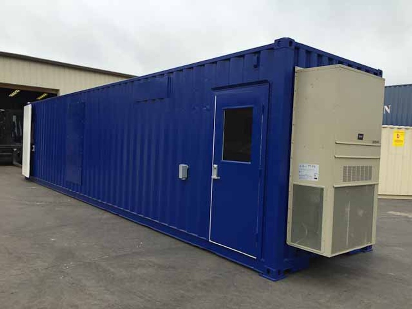 40ft High Cube container converted into temperature controlled modular E-House. Two personnel doors were installed on one side to allow for side access. The interior was finished and electrical was installed throughout, including lights, outlets, and a commercial HVAC system. The customer also requested a commercial vinyl floor overlay.