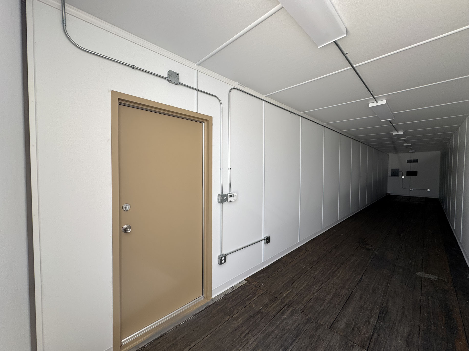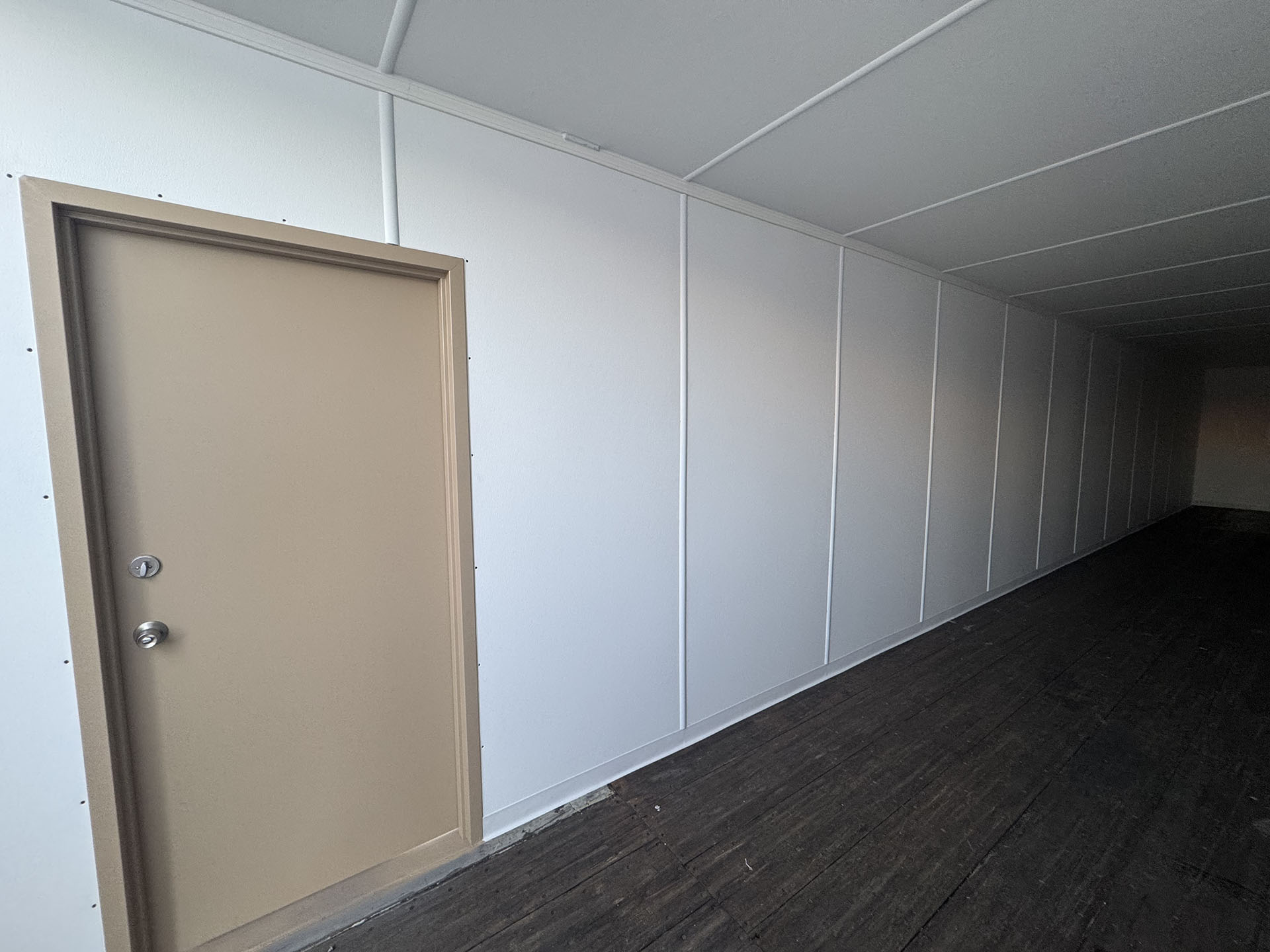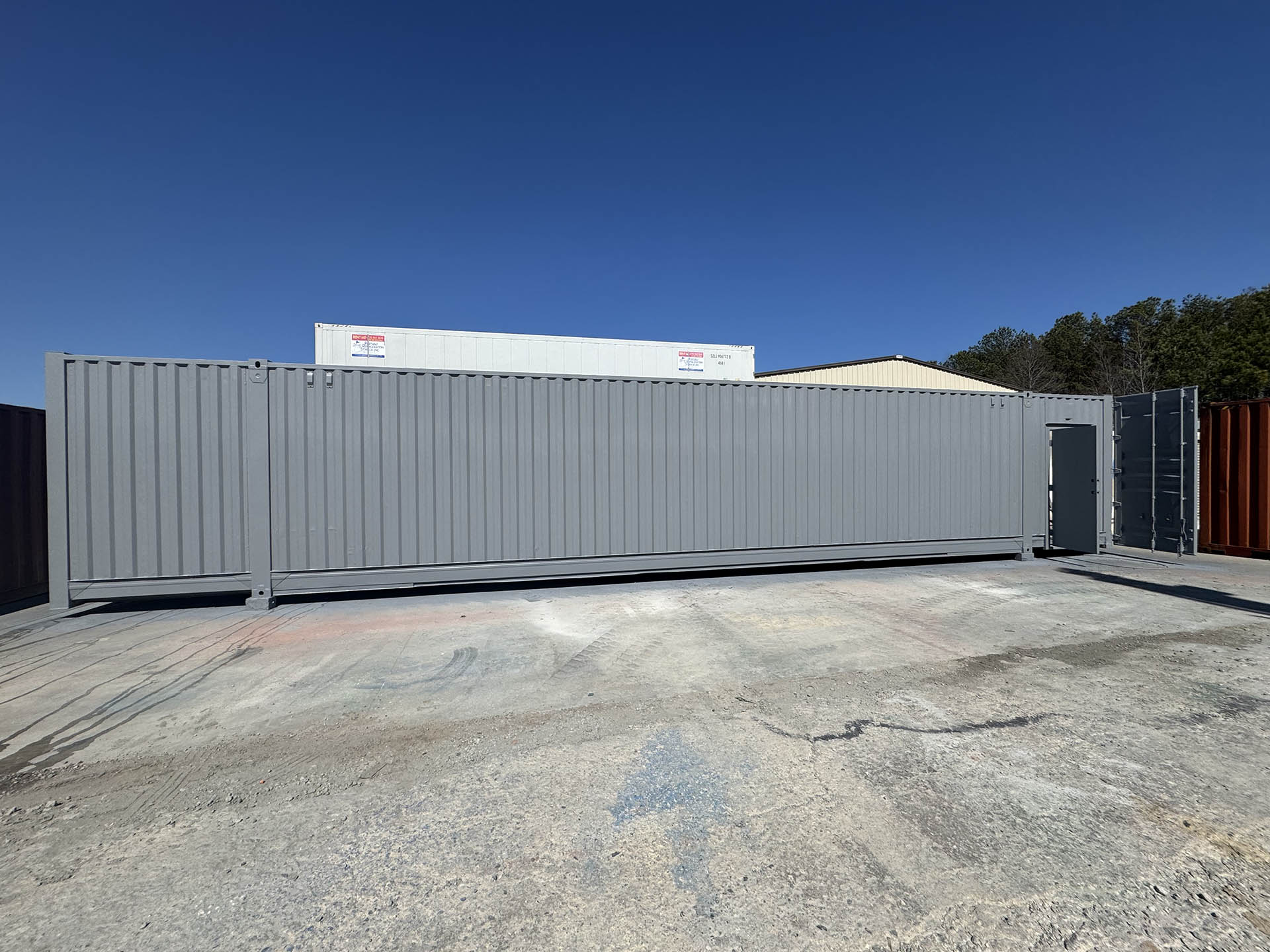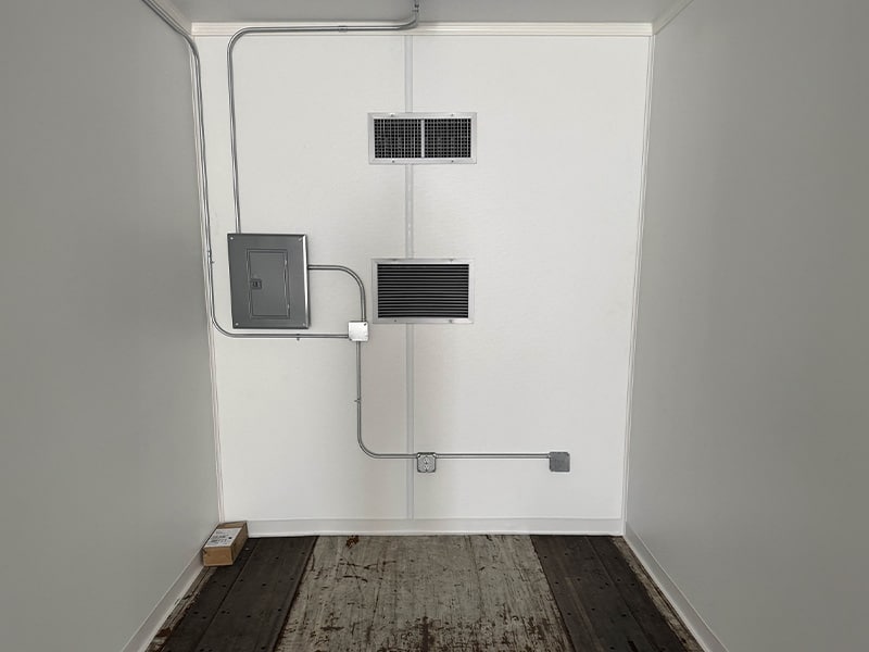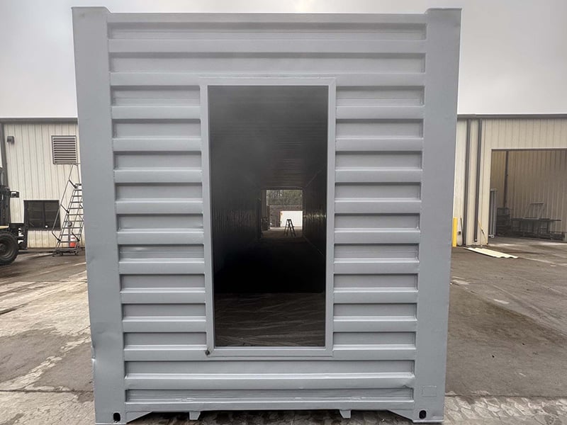 This 53’HC container was converted into a climate controlled mobile office space for a military base. The interior was completely finished and outfitted with lights, outlets, and a commercial HVAC system. An additional door was installed on the sidewall and the exterior was painted gray.