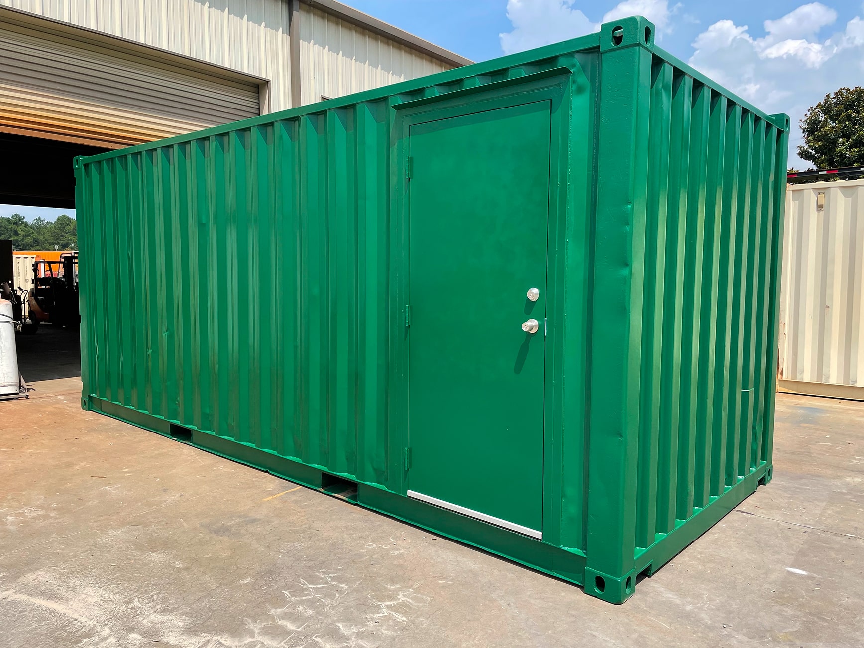 Shipping containers come standard with heavy-duty cargo doors positioned at one end, engineered specifically for maritime transport and designed to withstand the extreme conditions of ocean shipping. While these original cargo doors are very functional and provide exceptional security and complete weather sealing, they present practical challenges for everyday access in stationary applications. Having entry doors increases efficiency in daily operations and workflow productivity.