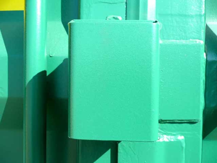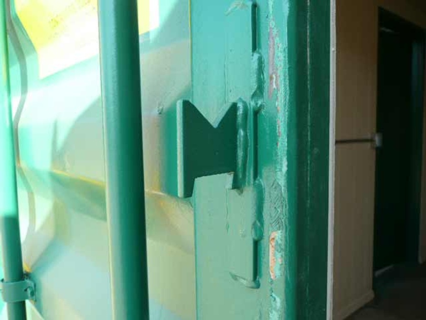 Our “Security Swing Arm” is used in conjunction with a personnel door. It’s a mechanism that we fabricate right in our shop. It is comprised of 1” x 2” steel tubing and is shaped like a “Y”. The mechanism is hinged on one end and swings over your door. There is an arm that extends across your door with our “Lock Box” on the end. You can place a padlock inside the box that is not visible and cannot be tampered with using bolt cutters. It’s a must-have for those that have personnel doors installed on their container.