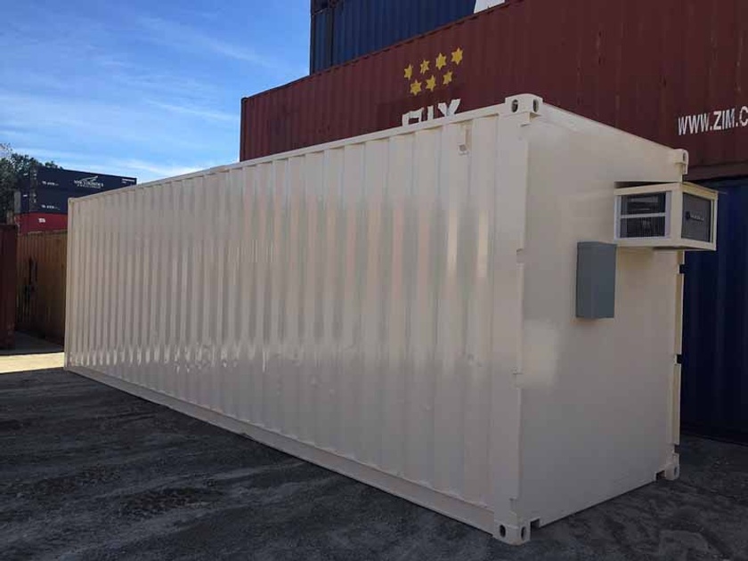 40ft High Cube container cut down to 30ft length and converted into an on-site temperature controlled storage unit for a retail clothing store.