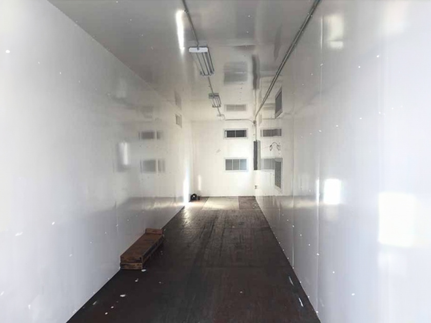 40ft High Cube container converted into temperature controlled modular E-House. Two personnel doors were installed on one side to allow for side access. The interior was finished and electrical was installed throughout, including lights, outlets, and a commercial HVAC system. The customer also requested a commercial vinyl floor overlay.