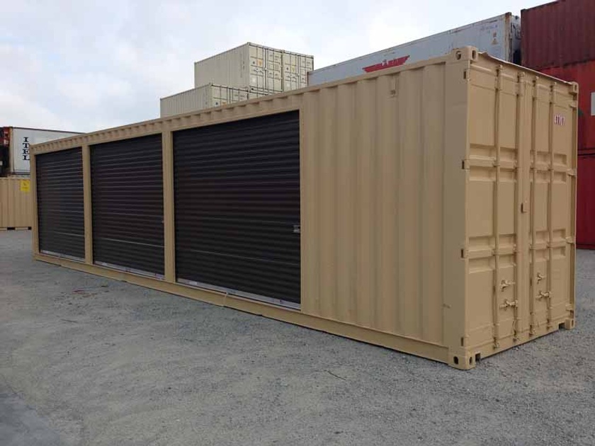 By adding multiple roll up doors, a shipping container can be transformed into a multi-purpose on-site mini storage unit. The mini storage containers can be converted into a variety of configurations. Roll up doors can be installed in the side walls, as well as the front (end opposite the existing doors). The roll up doors come in many different sizes and types. The interior of the mini storage container can also be insulated and heated/cooled. Lights can also be added to illuminate the interior.