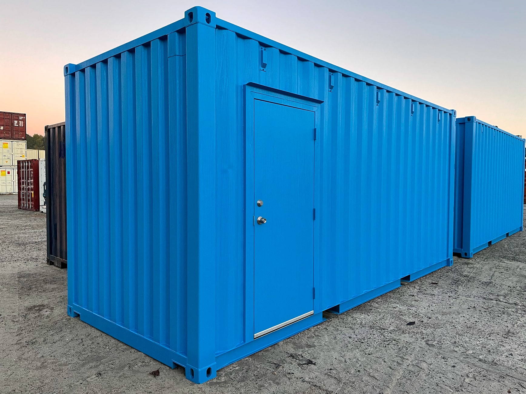 Shipping containers come standard with heavy-duty cargo doors positioned at one end, engineered specifically for maritime transport and designed to withstand the extreme conditions of ocean shipping. While these original cargo doors are very functional and provide exceptional security and complete weather sealing, they present practical challenges for everyday access in stationary applications. Having entry doors increases efficiency in daily operations and workflow productivity.