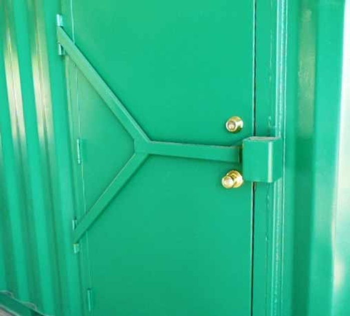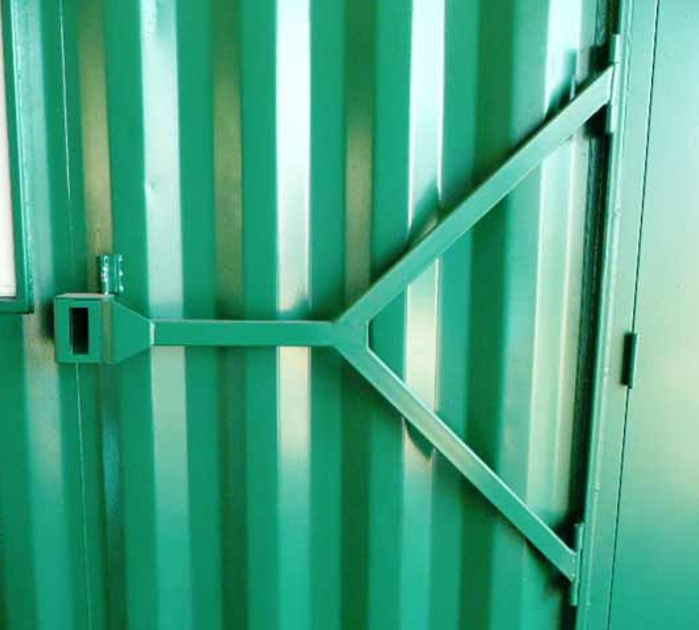 Our “Security Swing Arm” is used in conjunction with a personnel door. It’s a mechanism that we fabricate right in our shop. It is comprised of 1” x 2” steel tubing and is shaped like a “Y”. The mechanism is hinged on one end and swings over your door. There is an arm that extends across your door with our “Lock Box” on the end. You can place a padlock inside the box that is not visible and cannot be tampered with using bolt cutters. It’s a must-have for those that have personnel doors installed on their container.